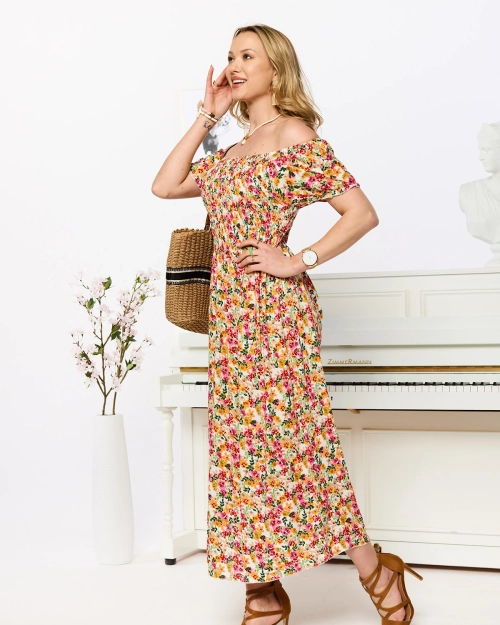 - Letní dámské šaty v midi délce, vyrobené z bavlněné látky s květinovým vzorem. Model s kulatým výstřihem a'la hiszpanka a gumou na šířku prsou a v pase. Model s krátkými rukávy. Noste je se sandály! POZNÁMKA: Přesnost měření (+/-) 1 cm.