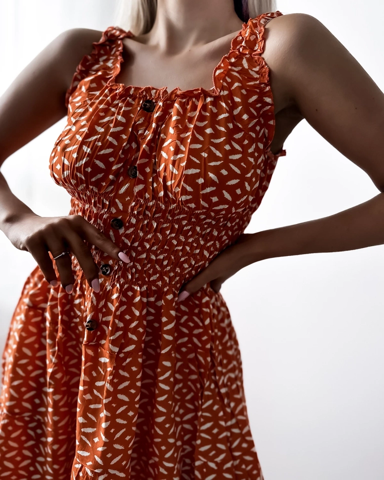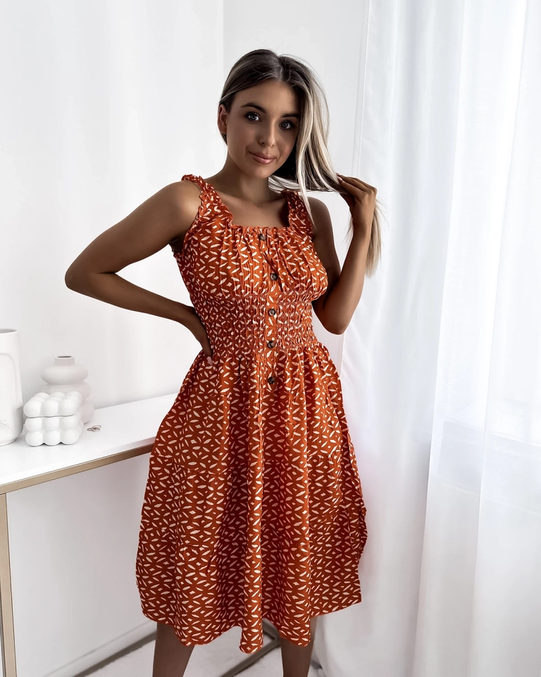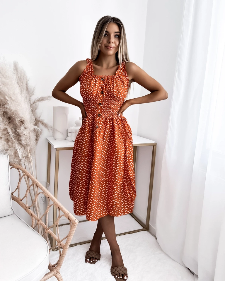 Dámské šaty pod kolena s potiskem v oranžové barvě- Oblečení