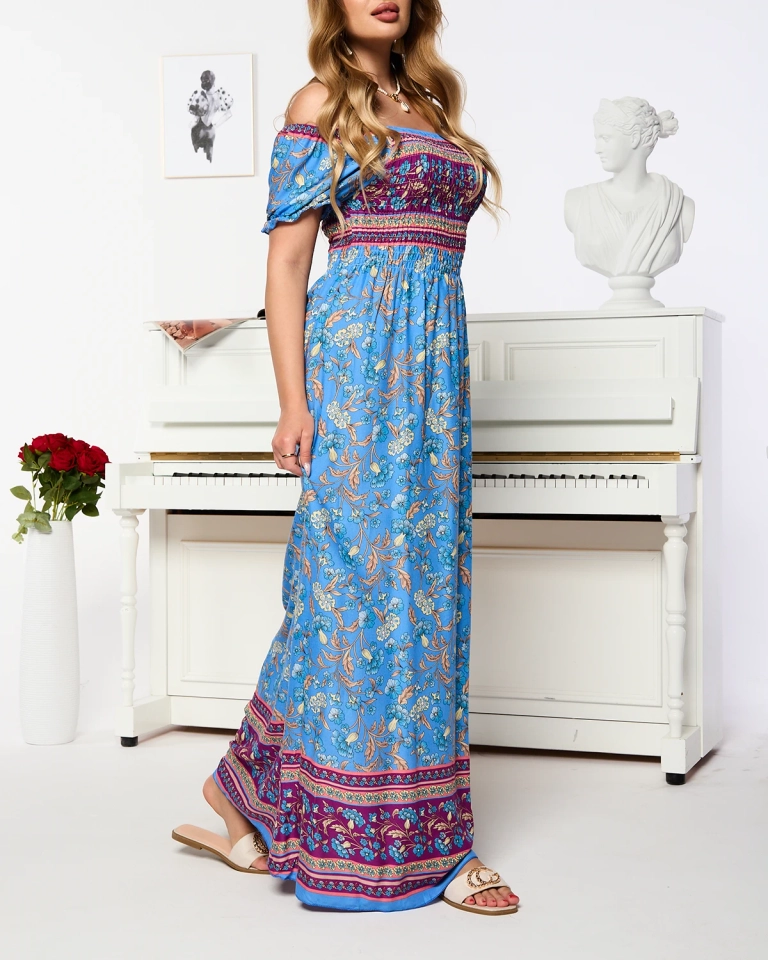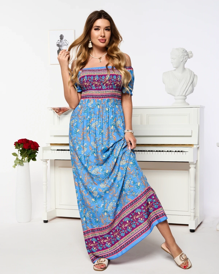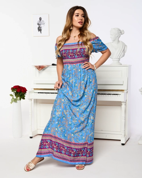 • Dámské midi šaty z lehkého a vzdušného materiálu. Model s odhalenými rameny a'la hiszpanka, má širokou gumu na prsou a v pase. Výrobek s krátkými rukávy, zdobený květinovým vzorem. UPOZORNĚNÍ: Přesnost měření (+/-) 1 cm