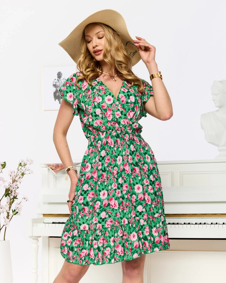 • Dámské krátké šaty z lehké látky s květinovým potiskem. Model s obálkovým výstřihem a krátkými rukávy. Mají pružný pásek pro zvýraznění pasu. Perfektně se hodí k sandálům! POZNÁMKA: Přesnost měření (+/-) 1 cm.