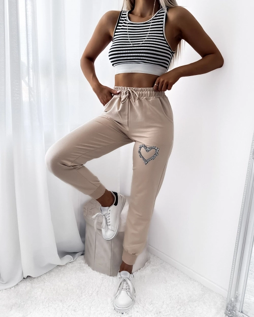 Dámské béžové tepláky se zirkonovým zdobením - Oblečení