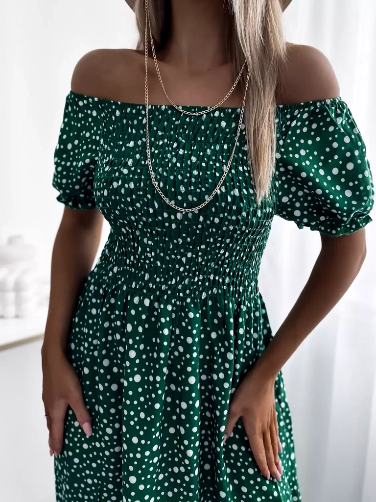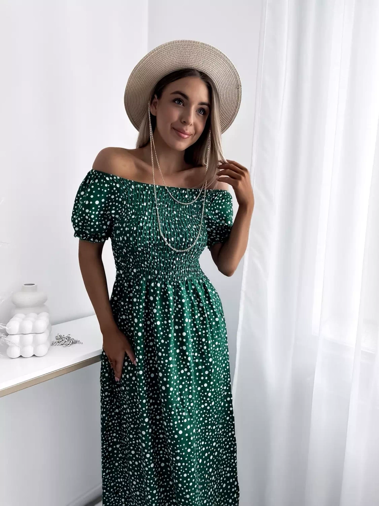 • Jarní dámské maxi šaty s hráškem, vyrobené z bavlněné látky. Model s kulatým výstřihem a'la hiszpanka a gumou na šířku prsou a v pase. Model s krátkými rukávy. Oblečte si je na procházku! POZNÁMKA: Přesnost měření (+/-) 1 cm.