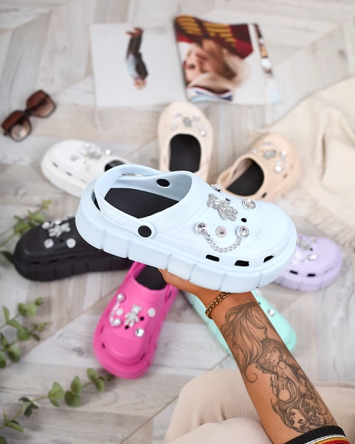 - Krásné dámské gumové žabky na silnější podrážce. Ažurový svršek zdobený zirkony. Ideální volba na doma, zahradu i na dovolenou!