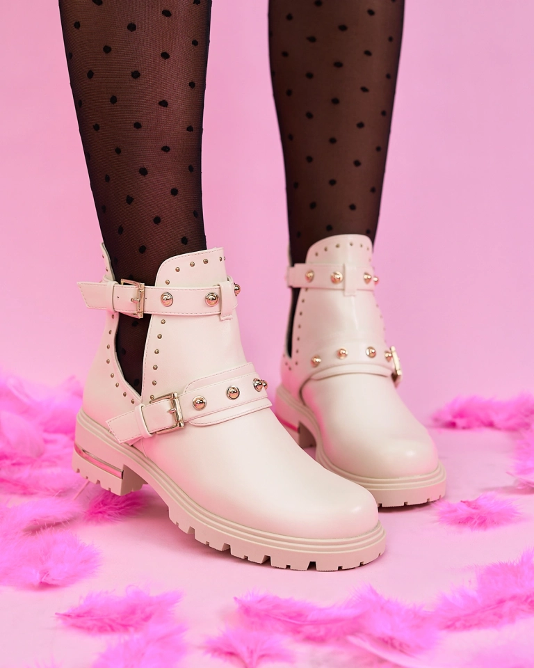 Royalfashion Cream dámské zdobené kozačky Jewel Walk na plochém podpatku