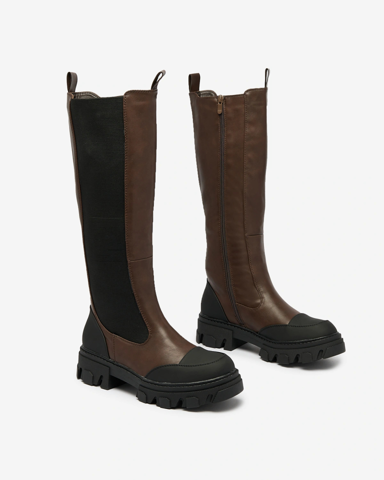 • Dámské kozačky do půli lýtek, vyrobené z ekokůže s látkovou stélkou. Model na plochém podpatku. Ozdobné matné vsadky z ekologické kůže na nártu a patě. Obuv se zapínáním na zip s elastickou vsadkou na boku.