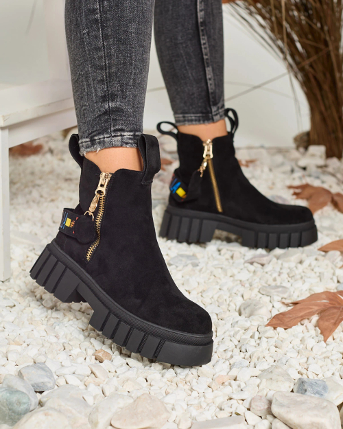 • Stylové kozačky na silnější podrážce z ekokůže. Zaoblený nos, střed vyplněný kožešinou. Obuv se zapíná na zip. Model má ozdobný zip a odnímatelný pásek. Skvělé boty k elegantním podzimním outfitům!