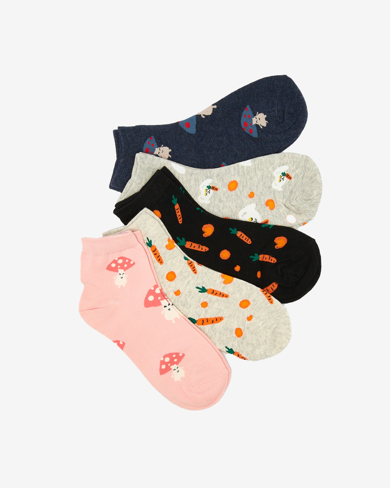 - Sada vysokých dámských ponožek 5 ks, vyrobených z příjemného bavlněného materiálu s barevným potiskem. Dokonale se přizpůsobí noze, poskytují volnost pohybu a každodenní pohodlí.
