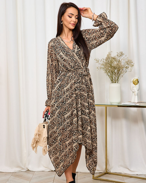 Royalfasion Tmavě hnědé dámské dlouhé šaty s módním potiskem