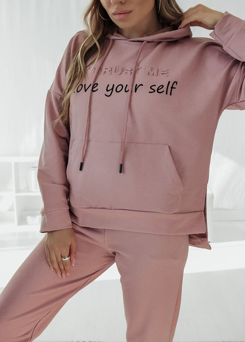- Dámská mikinová souprava zdobená nápisy, vyrobená z bavlněné tkaniny. Mikina se nosí přes hlavu, má dlouhé rukávy a kapuci. Kalhoty mají 2 nakládané kapsy, v pase gumu a nohavice. Ideální pro ty, kteří ocení pohodlí.