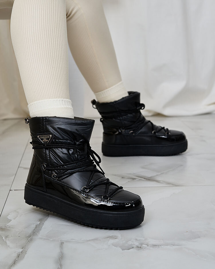 - Dámské sněhule se svrškem z kombinace eko lakované kůže a materiálu a'la oilcloth. Zateplení uvnitř v podobě kožíšku, nazouvací boty. Model má na konci svršku lem. Ideální na zimu!