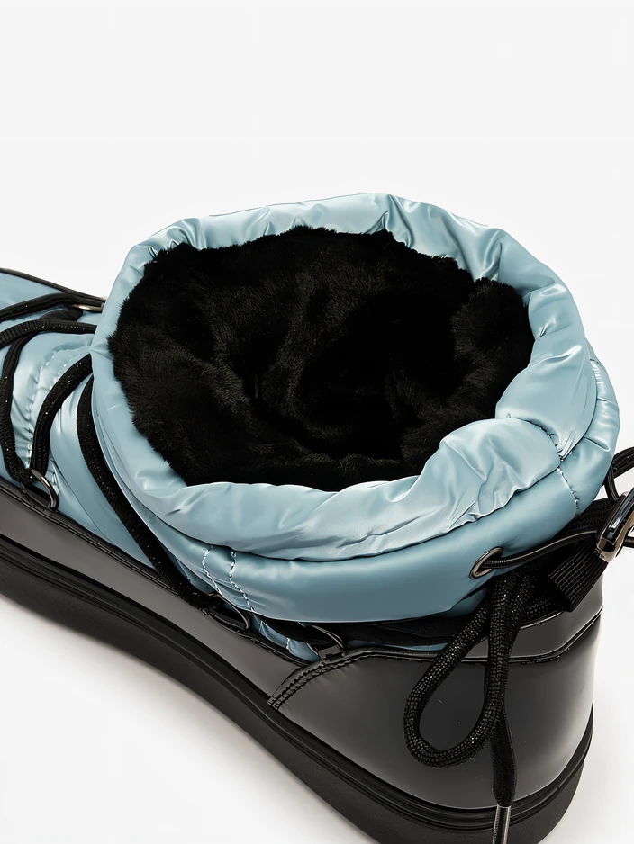 - Dámské sněhule se svrškem z kombinace eko lakované kůže a materiálu a'la oilcloth. Zateplení uvnitř v podobě kožíšku, nazouvací boty. Model má na konci svršku lem. Ideální na zimu!
