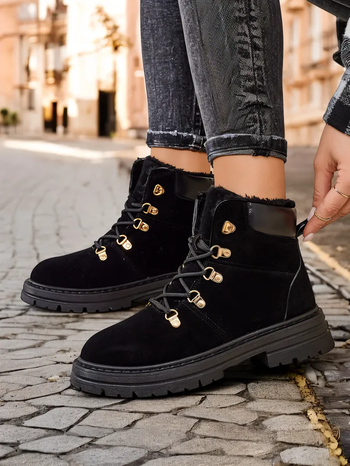 - Zateplené dámské trapézy, vyrobené z eko nubuku. Vázaný svršek, zateplený vnitřek v podobě kožíšku. Betonová obuv do nepříznivého počasí!