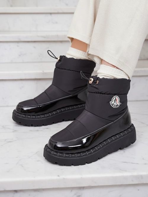 - Nadčasové dámské sněhule. Svršek modelu z materiálu a'la olejovka a vložky z lakované ekokůže. Zateplení uvnitř v podobě kožíšku, boty se nazouvají a mají stahovací pásek. Ideální na chladnější období!