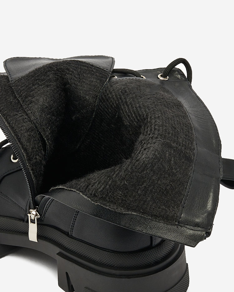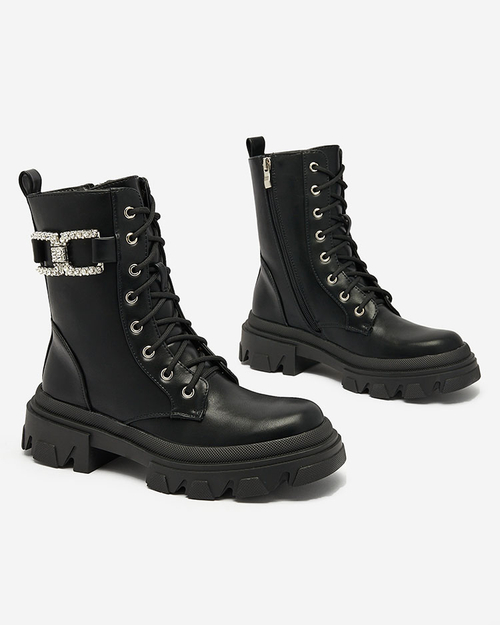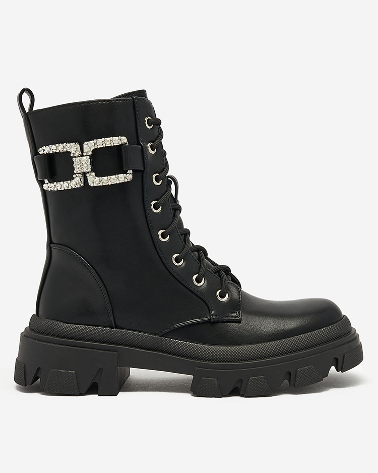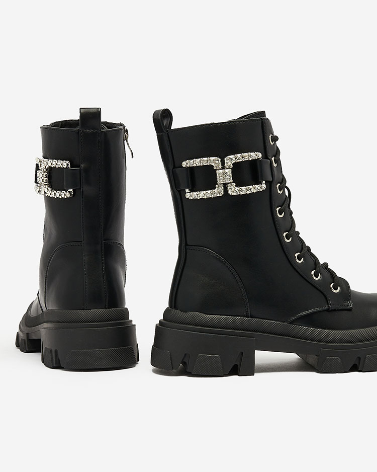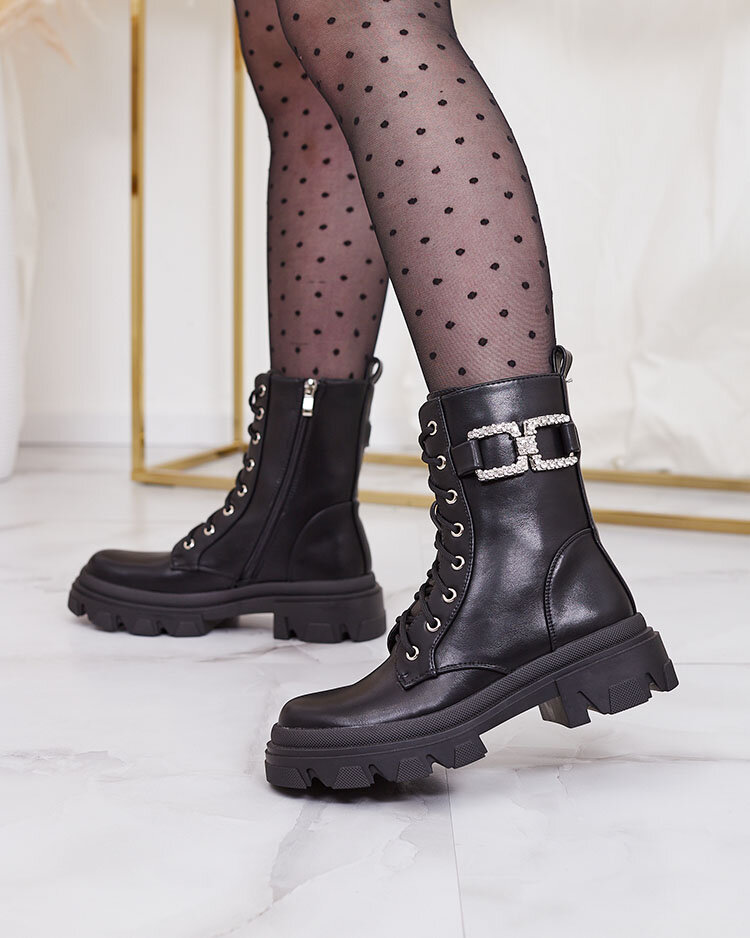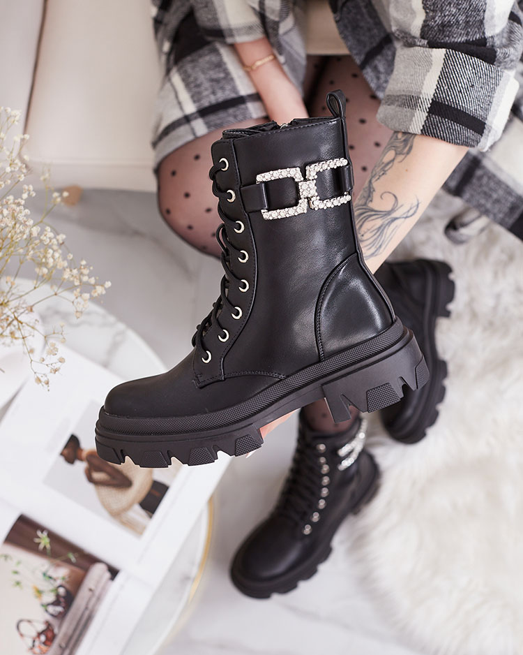 - Nadčasové dámské šněrovací boty na silnější podrážce. Svršek je vyroben z matné ekologické kůže, střed je podšitý kožešinou. Svršek zdobí přezka se zirkony. Tento pár nesmí chybět ve vašem podzimním šatníku!