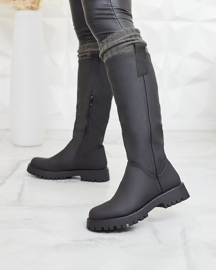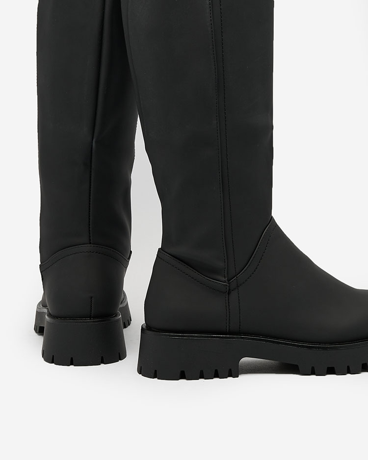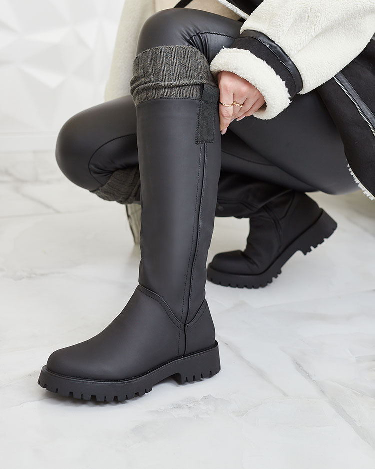- Dámské vysoké kozačky nad kolena, vyrobené z matné ekokůže. Model je na plochém podpatku a má měkký kožešinový lem. Obuv je nazouvací a má zapínání do půli lýtek na zip.
