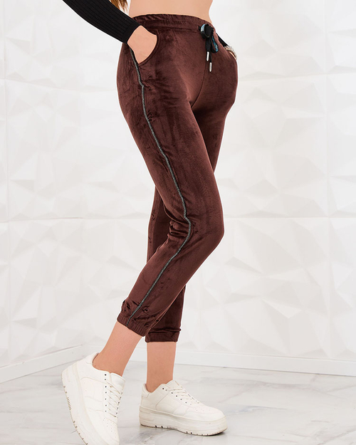 Royalfashion Hnědé velurové dámské tepláky se zirkony