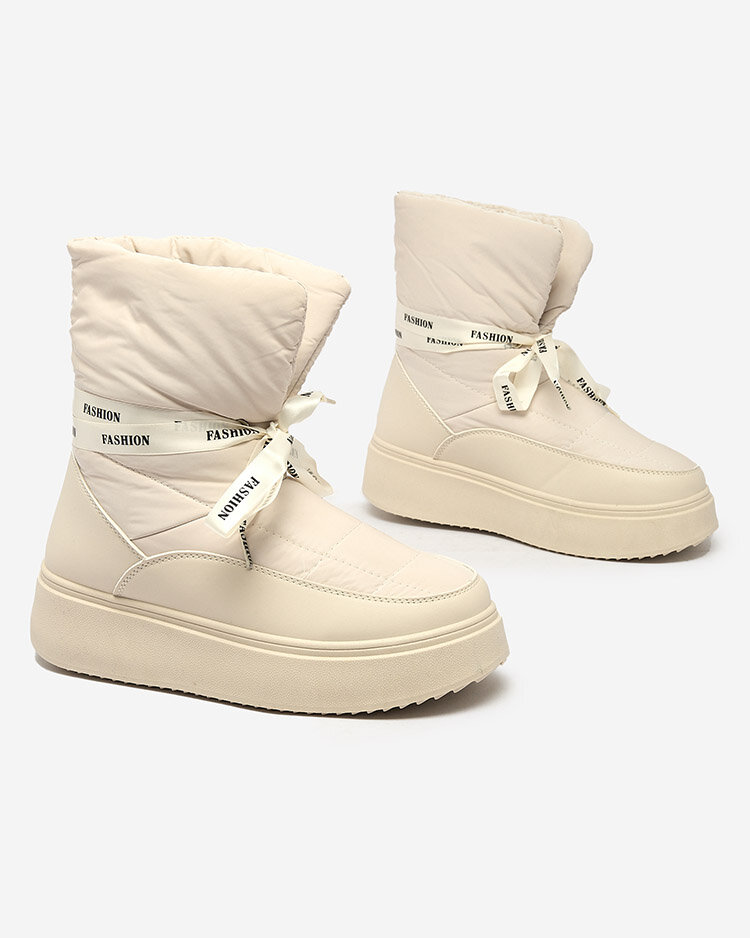 - Senzační dámské sněhule. Svršek je vyroben z materiálu a'la cerata a vložky z ekologické kůže. Uvnitř zateplení v podobě kožíšku, boty jsou nazouvací a mají stuhu. Ideální na chladnější období!