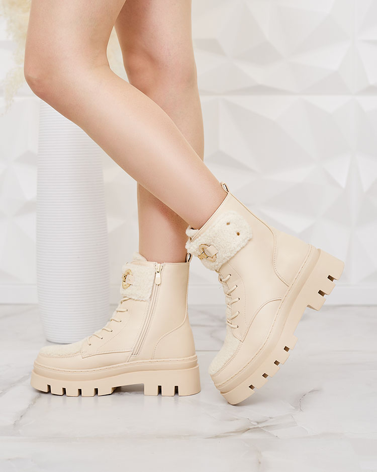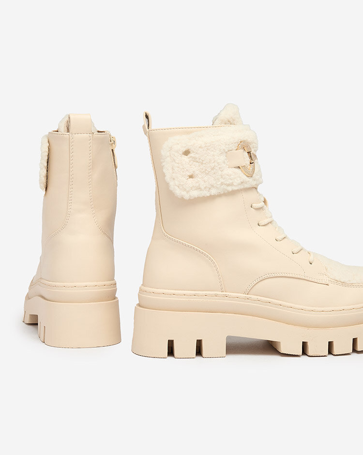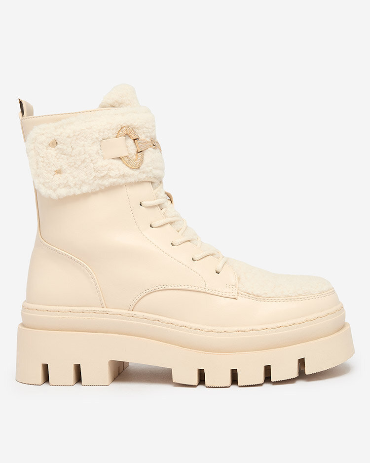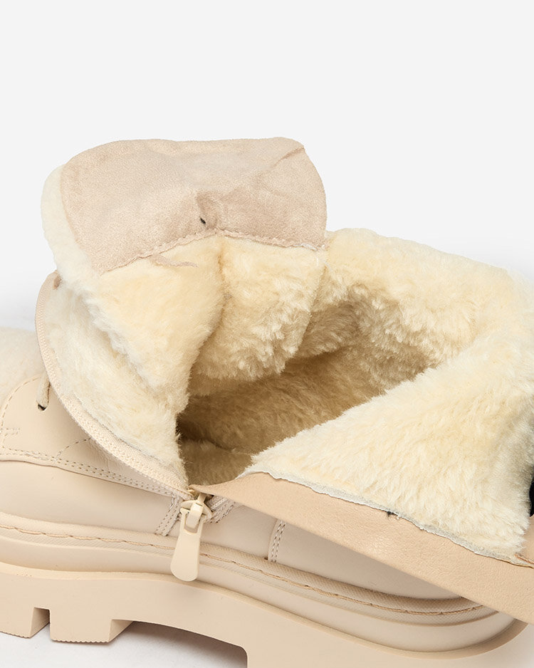 - Módní dámské kozačky z ekologické kůže a vložky z ovčí kůže. Uvnitř potažené kožešinou. Silná podrážka s drážkami zajišťuje stabilitu a pohodlí při chůzi. Model se šněrováním a zapínáním na zip.