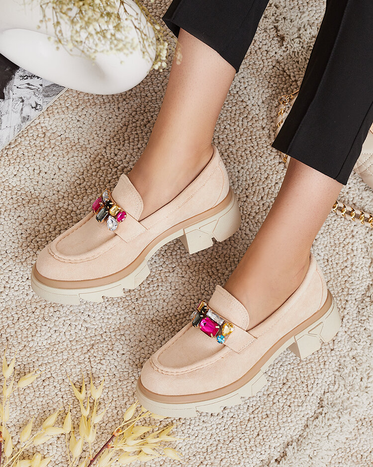 - Krásné dámské mokasíny na pevné podrážce. Model v ležérním stylu a je vyrobený z ekologické semišové kůže, stélka je z přírodní kůže. Na nártu ozdoba s barevnými kamínky. Perfektní základ pro mnoho každodenních looků!