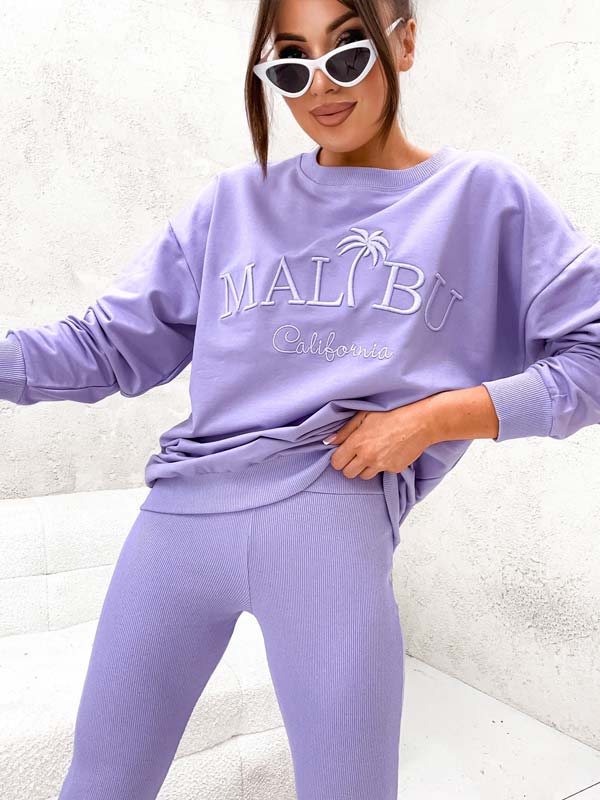 - Originální dámská mikinová souprava z příjemného materiálu. Mikina s dlouhým rukávem bez kapuce a nápisem s nášivkou. Žebrované legíny se širokým elastickým pasem.