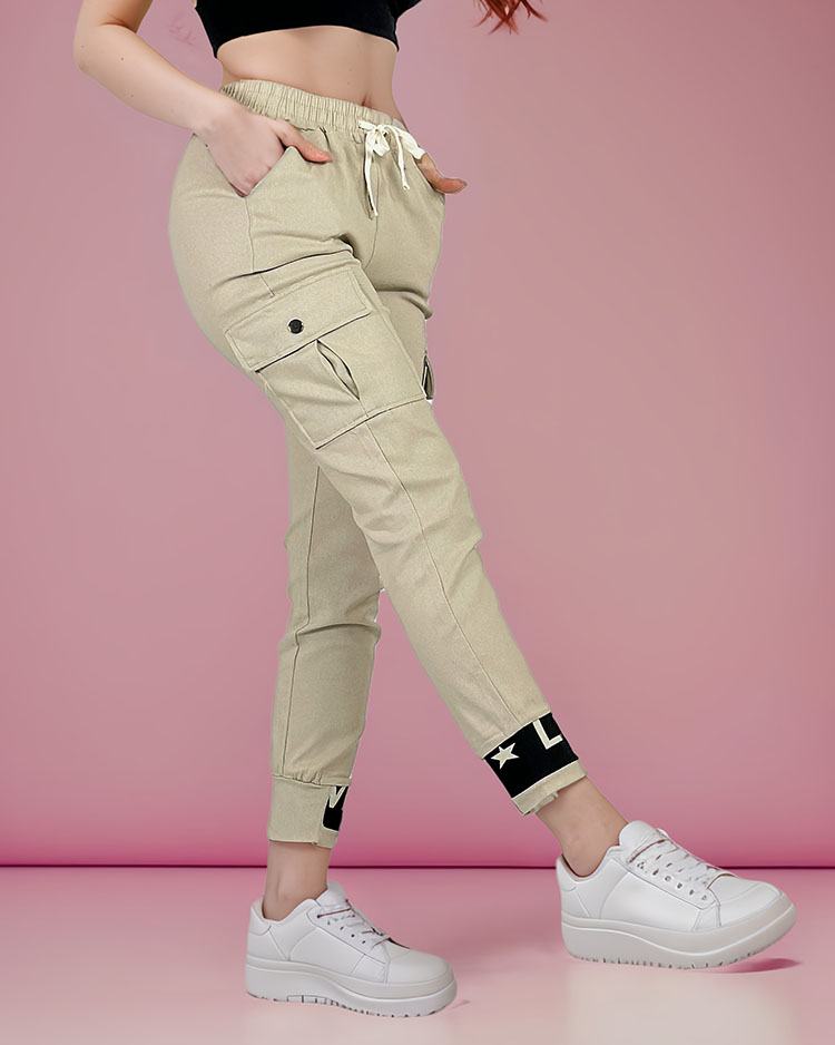 - Pohodlné dámské bojové kalhoty z příjemné látky. Model má 4 kapsy, včetně těch na bocích. Kalhoty mají v pase gumu a vázání.