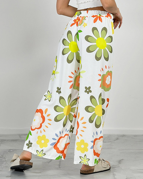 - Dámské široké kalhoty s květinovým vzorem. Model se středně vysokým pasem, s gumou a zavazováním v pase, má na přední straně kapsy. Móda a pohodlí v jednom!