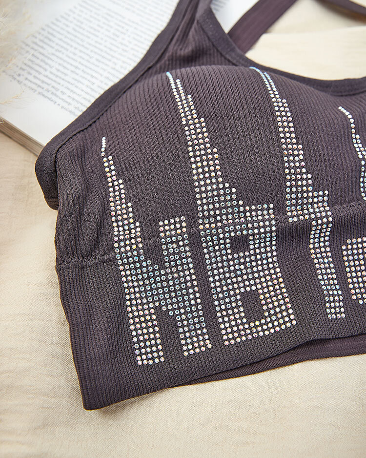 - Dámská sportovní podprsenka z elastického, příjemného materiálu. Model s nenastavitelnými, překříženými ramínky, bez zapínání a s vyjímatelnými vsadkami, ve spodní části zakončený širokou gumou a zdobený zirkony. Dokonale se přizpůsobí postavě.
