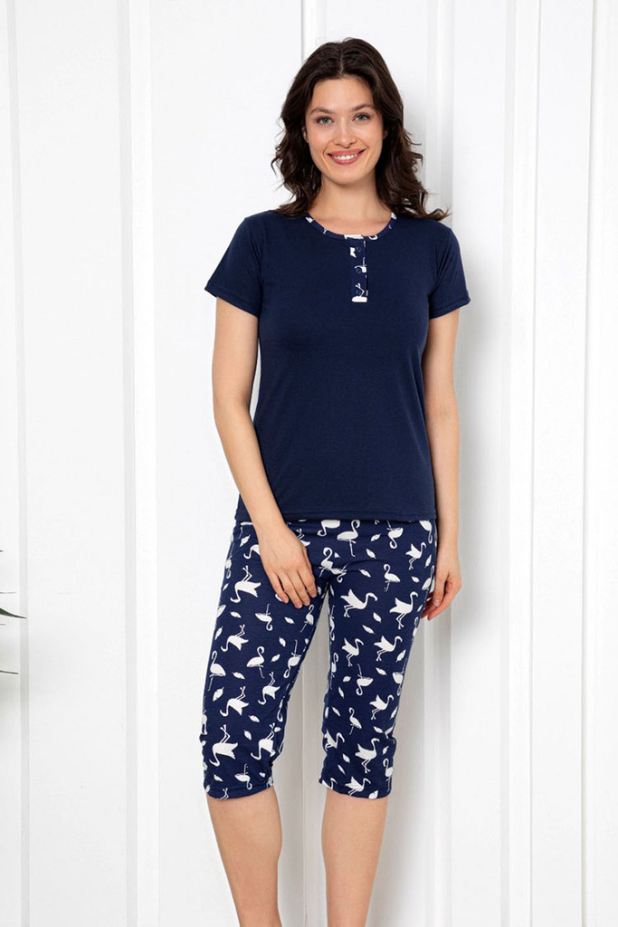 - Dámské dvoudílné pyžamo z bavlněné tkaniny s ozdobným potiskem. Souprava má halenku s dlouhými rukávy a 3/4 kalhoty s pružným pasem.