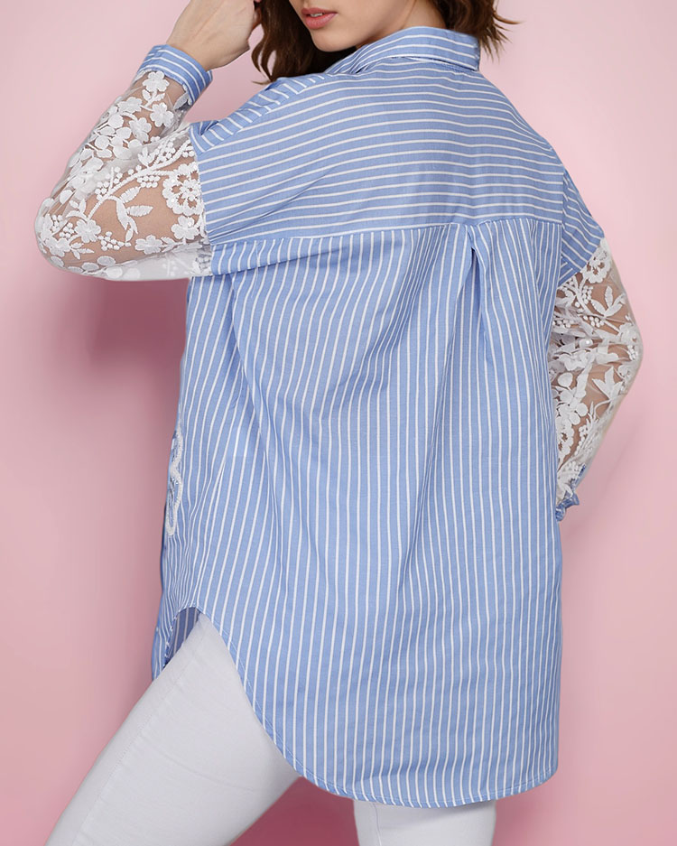• Dámská košile s dlouhými krajkovými rukávy zdobenými pruhovaným vzorem. Navíc lesklá nášivka. Model se zapíná na knoflíčky. Musí být v šatníku každé ženy!