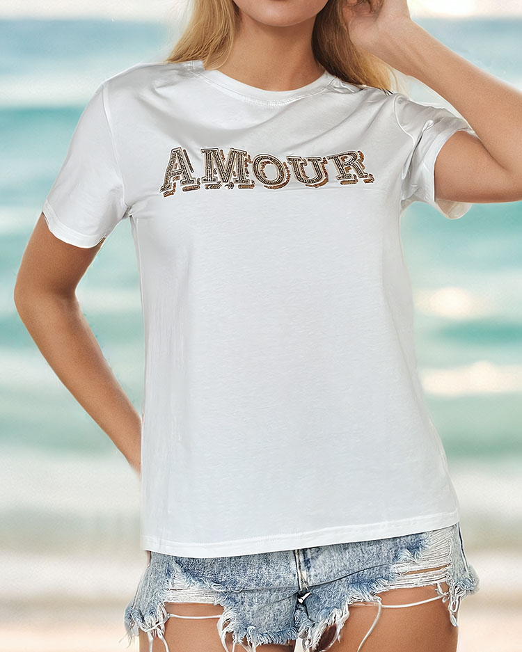• Jedinečné dámské tričko s krátkými rukávy a kulatým výstřihem. Přední část trička zdobí potisk spolu s třpytivými flitry a zirkony. POZNÁMKA: Přesnost měření (+/-) 1 cm.
