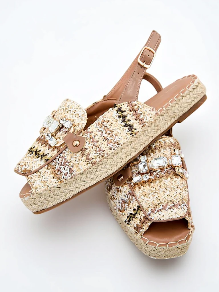 • Jedinečné dámské espadrilky ze syntetického materiálu. Plochá podrážka zdobená jutovou šňůrkou poskytuje pohodlí. Nazouvací model s koženým páskem a odhalenými prsty. Perfektní doplněk letních outfitů!