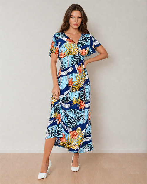 - Jedinečné dámské šaty z lehké tkaniny. Výrobek v midi délce, s krátkými rukávy a srdíčkovým výstřihem. Model zdobí potisk. Pociťte léto v tomto modelu!