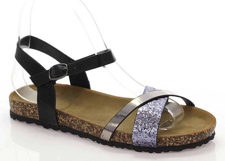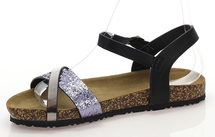 - Pohodlné sandály vyrobené z ekologické kůže. Přední pruh zdobený třpytkami. Spona na boku. Jsou ideální pro teplejší dny