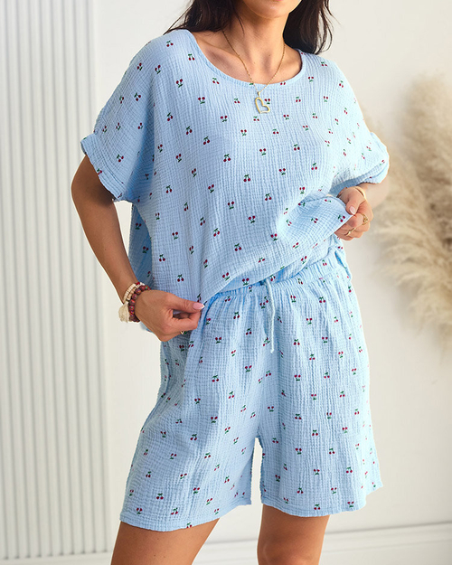 - Dámský komplet z příjemného materiálu. Model má ozdobný potisk. Halenka s krátkými rukávy a krátké šortky s pružným pasem. Pociťte léto v této nádherné soupravě!