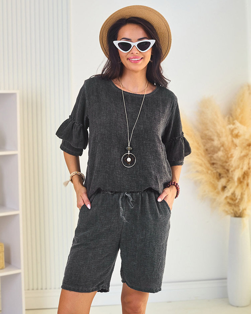 - Dámská souprava z příjemného materiálu. Halenka s ozdobnými krátkými rukávy a krátké šortky s pružným pasem. Součástí soupravy je navíc náhrdelník. Pociťte léto v této nádherné soupravě!