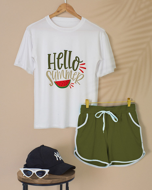 • Dámský komplet z příjemného materiálu. Model má potisk. Halenka s krátkými rukávy a krátké šortky s pružným pasem. Pociťte léto v této nádherné soupravě!