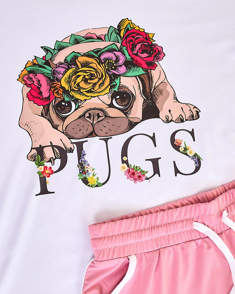 - Dámský komplet z příjemného materiálu. Model má potisk s pejskem. Halenka s krátkými rukávy a krátké šortky s pružným pasem. Pociťte léto v této nádherné soupravě!