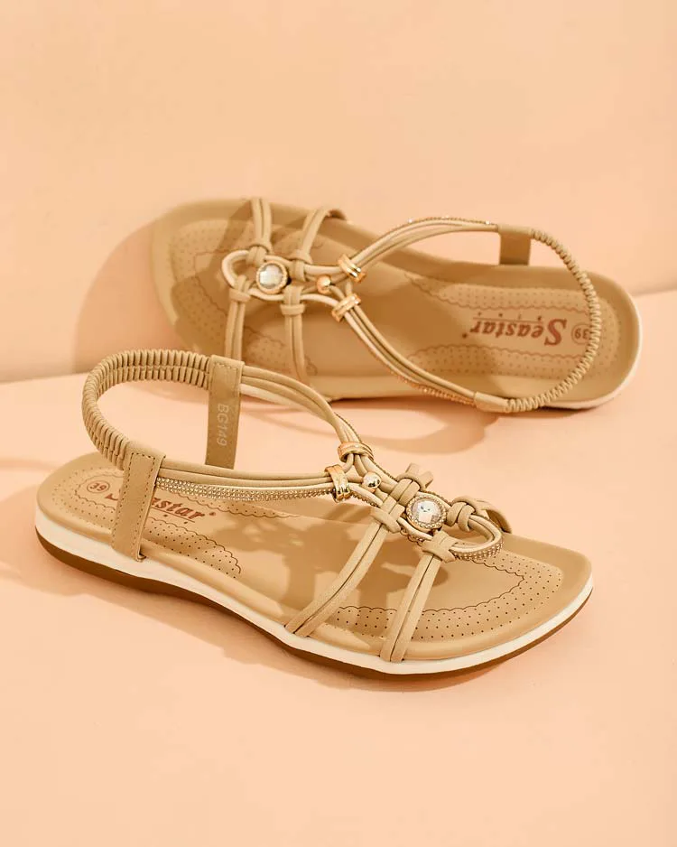 - Dámské sandály na ploché podrážce - ideální nápad pro horké letní dny. Model zcela vyrobený z ekologické kůže. Svršek zdobený kamínky a ozdobnými zirkony.