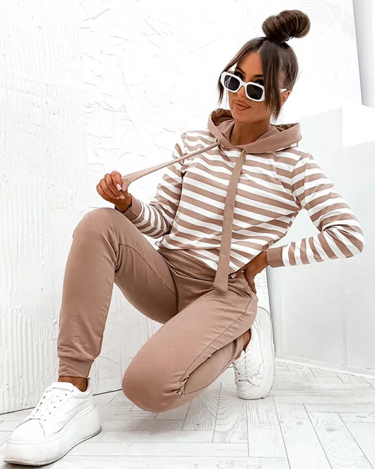 - Dámská souprava z příjemného materiálu v pruhovaném vzoru. Slušivá mikina s dlouhými rukávy a kapucí. Tepláky s pružným pasem a 2 kapsami. Ideální volba pro každodenní nošení!