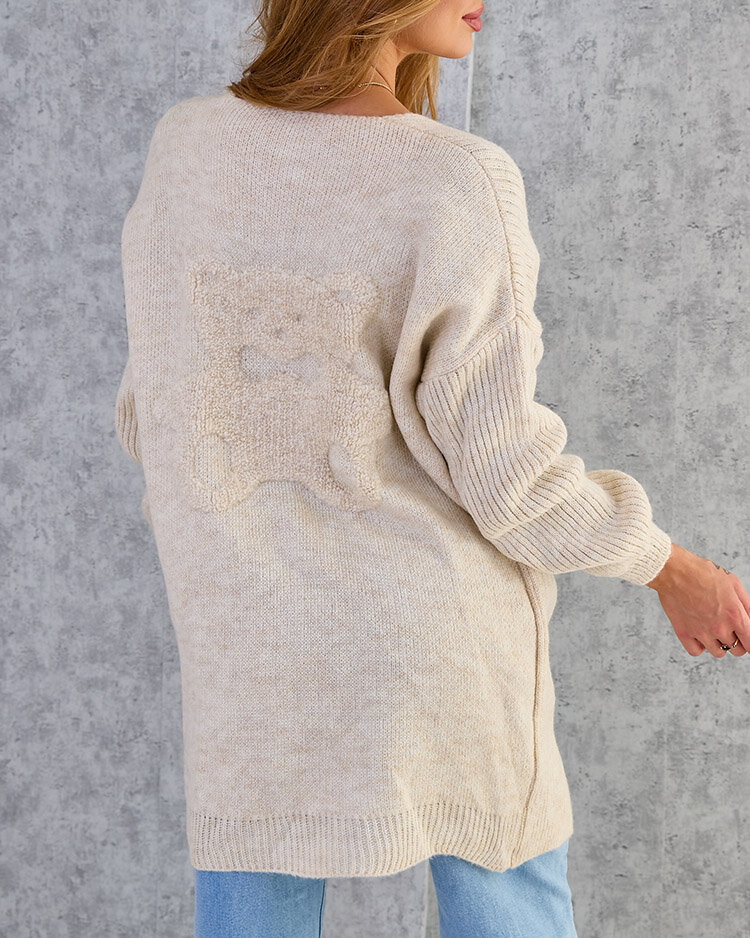 - Krásný dámský svetr s přehozem, vyrobený z příjemného pleteného materiálu. Na zadní straně je ozdobný medvídek. Must have vašeho šatníku, který doplní podzimní styling! UPOZORNĚNÍ: Přesnost měření (+/-) 1 cm.