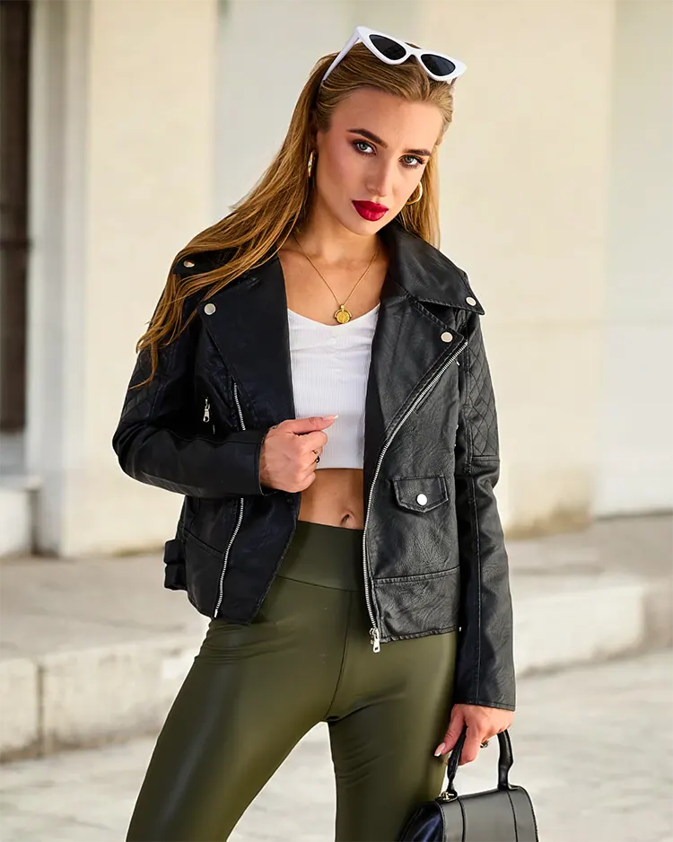 - Jedinečná dámská bunda Ramones z měkké ekokůže - ideální volba na jaro! Model se zapíná na zip, má také kapsy. POZNÁMKA: Přesnost měření (+/-) 1 cm.
