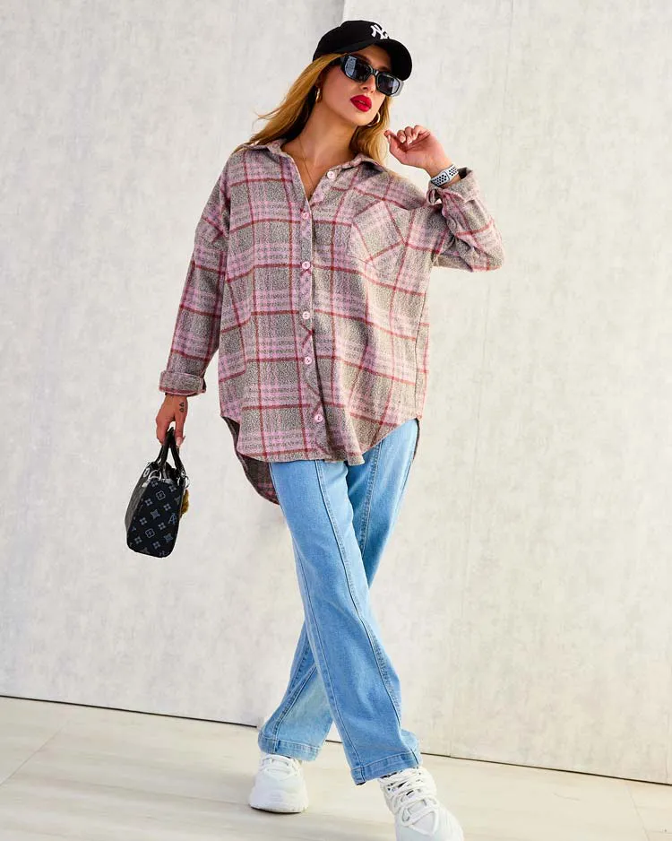 - Dámská kostkovaná košile nadměrného střihu má dlouhé rukávy, elegantní límeček a 1 kapsu. Skvěle se hodí na podzim!