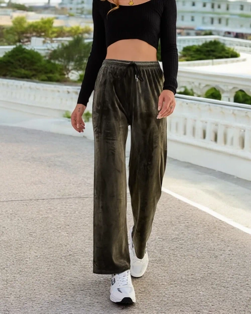 - Nadčasové dámské tepláky z měkkého materiálu a'la velur. Model s jednoduchým střihem, má dvě nakládané kapsy a pružný pas a nohavice. Ideální volba pro každodenní nošení!