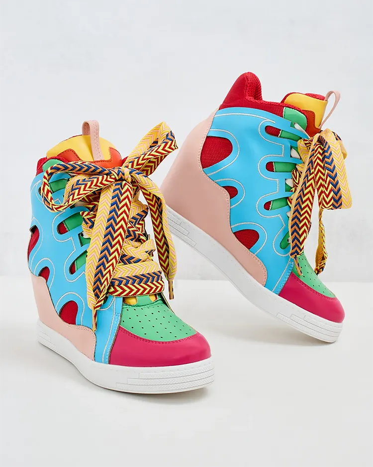 • Sportovní dámské boty na podpatku, vyrobené z kombinace ekokůže a ekokůže. Obuv se zavazuje na ozdobné tkaničky, uvnitř stélka z ekokůže.