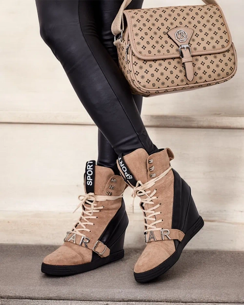 - Sportovní dámské boty na podpatku, vyrobené z kombinace ekokůže a ekokůže. Vázané boty s ozdobným zdobením na svršku, uvnitř látková stélka.