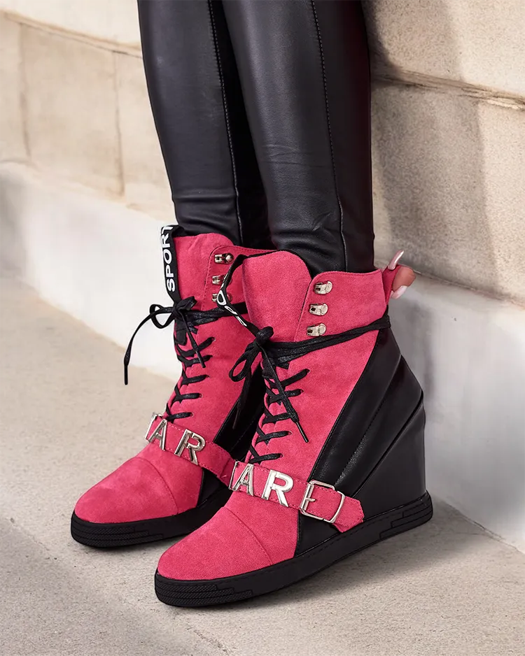 - Sportovní dámské boty na podpatku, vyrobené z kombinace ekokůže a ekokůže. Vázané boty s ozdobným zdobením na svršku, uvnitř látková stélka.