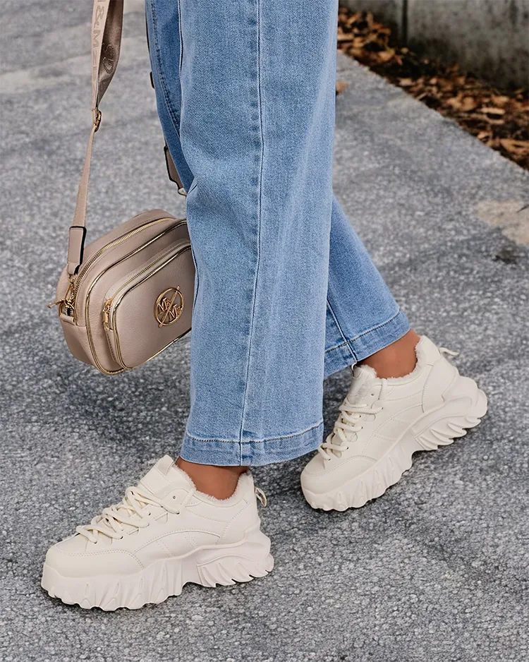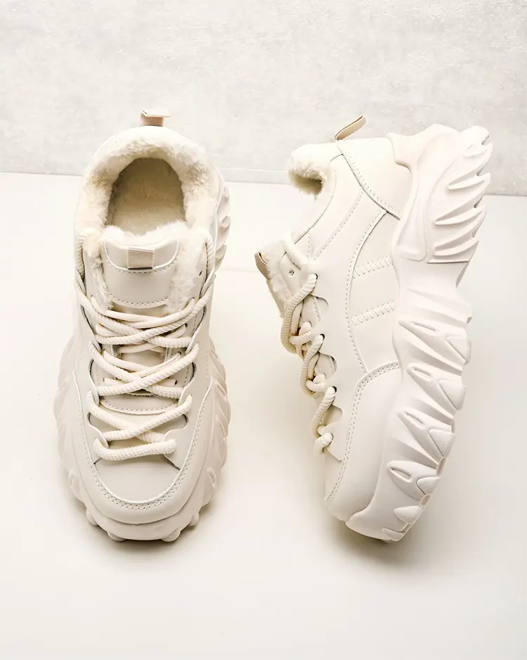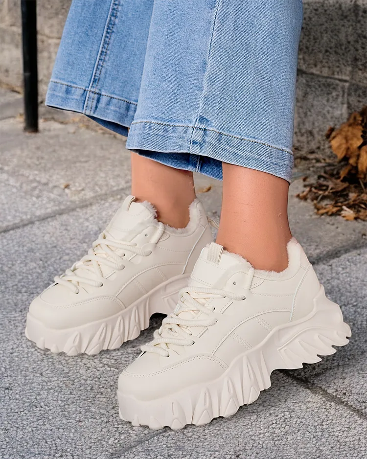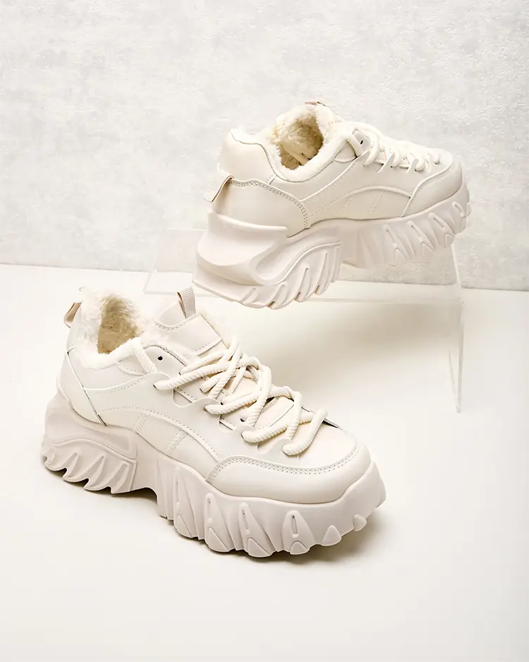 - Dámská zateplená sportovní obuv typu tenisky na silnější podrážce. Šněrovací svršek z matné ekologické kůže. Uvnitř měkký kožíšek. Super doplněk k zimním ležérním outfitům!