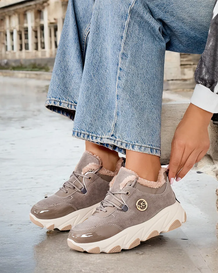 - Dámská zateplená sportovní obuv na silnější podrážce. Šněrovací svršek z ekologické semišové kůže. Uvnitř měkký kožíšek. Super doplněk k vašim zimním ležérním outfitům!