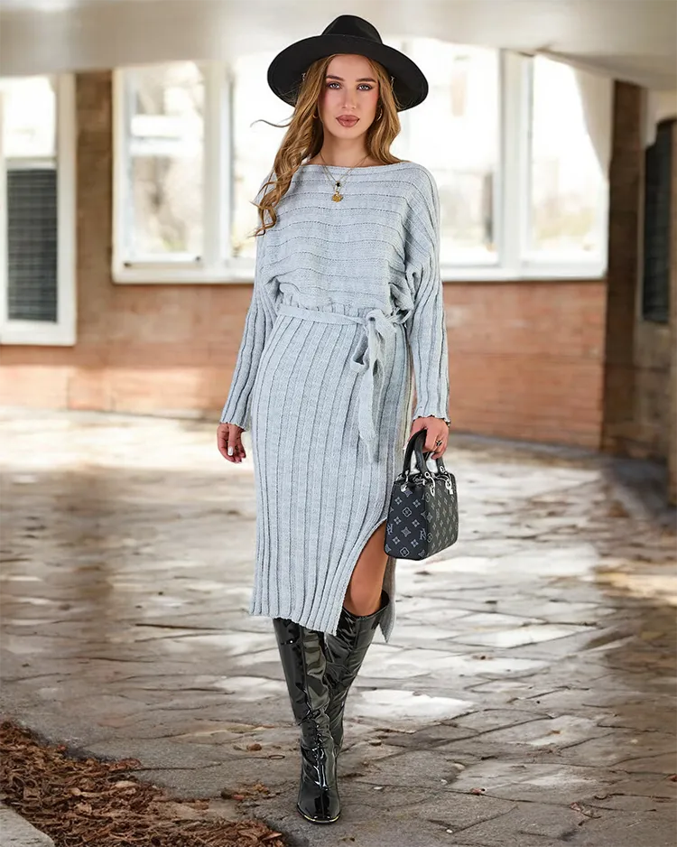 - Dámské midi svetrové šaty s dlouhými rukávy a kulatým výstřihem. V pase navíc pásek. Must have této sezóny! UPOZORNĚNÍ: Přesnost měření (+/-) 1 cm. Rozměry měřeny na plocho.