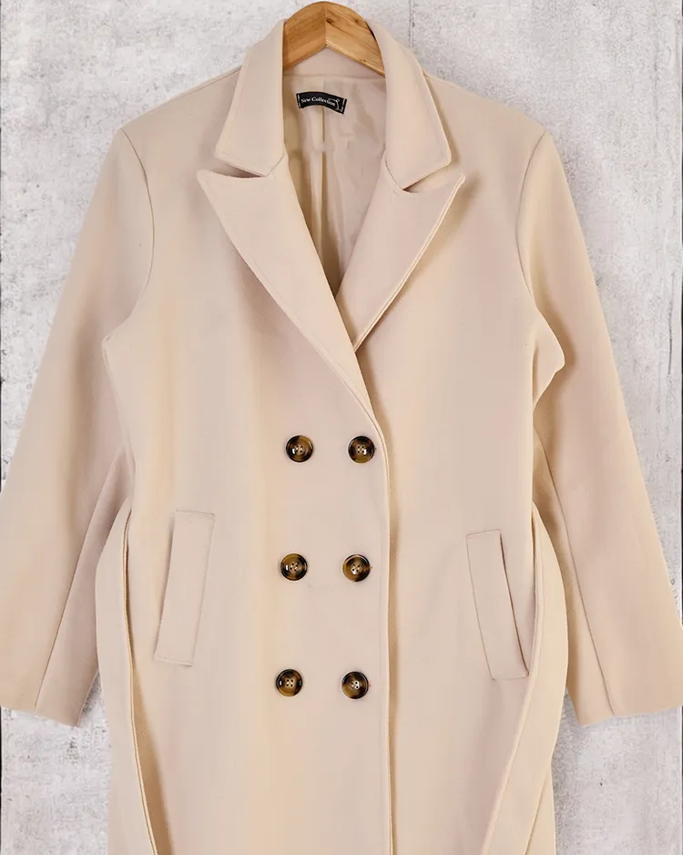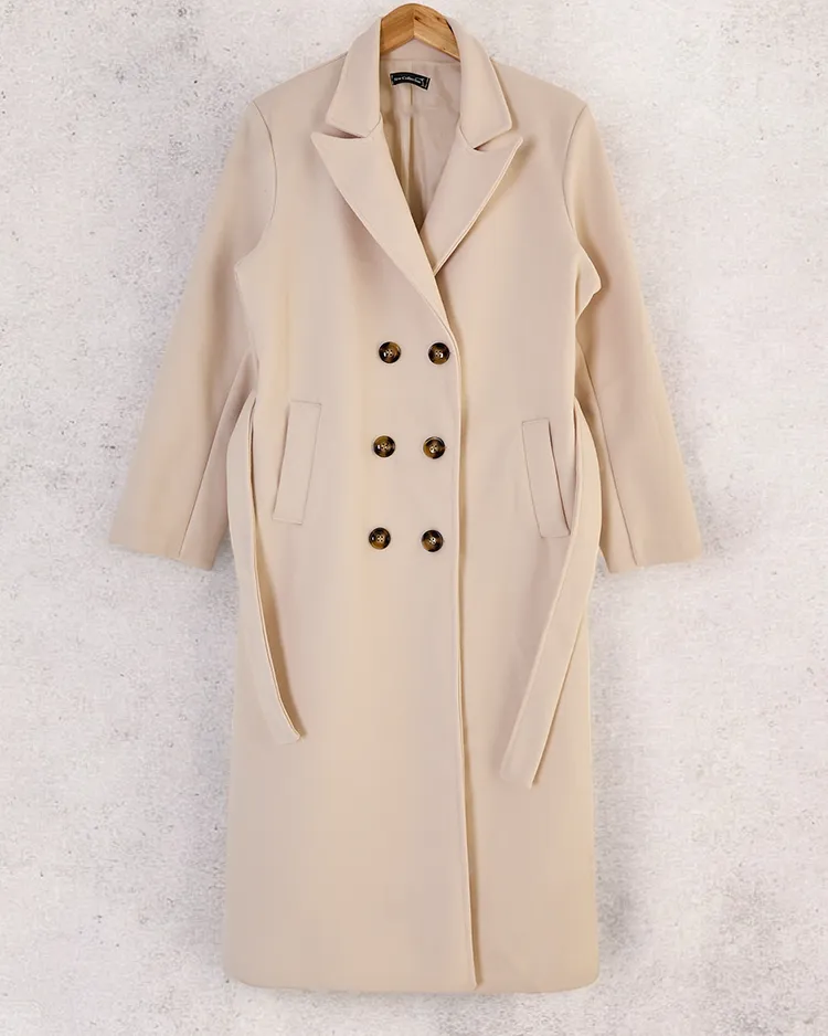 • Dlouhý dámský kabát z příjemného materiálu. Model má dlouhé rukávy, zapínání na knoflíky a ozdobné vázání. Má podšívku. Ideální volba na podzim! UPOZORNĚNÍ: Přesnost měření (+/-) 1 cm. Rozměry měřeny na plocho.